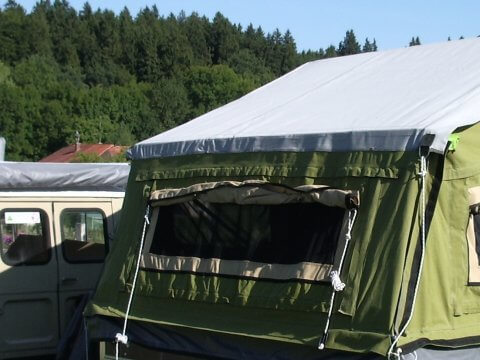 | Dach-Material | Dach besteht aus 450g/m² Silverguard Ripstop-Polyester-Baumwollmischung, wasserdicht, Polyurethan imprägniert |