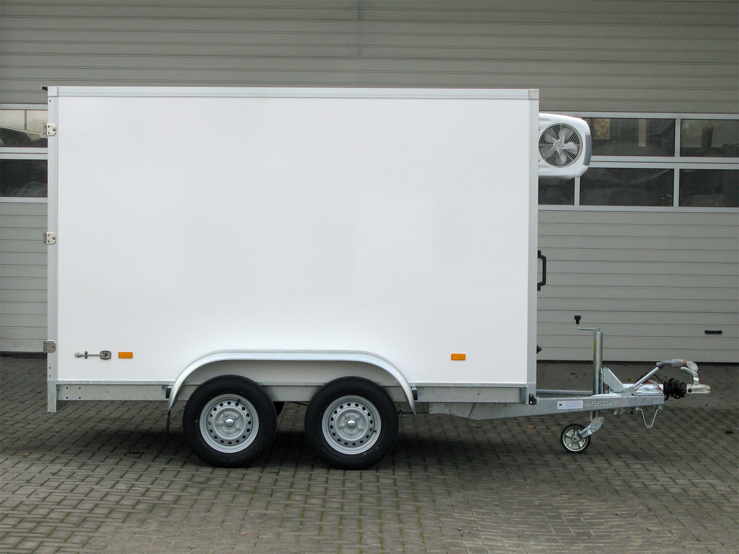 Dieses Modell ist serienmäßig mit hochwertigen Isolierplatten ausgestattet, die aus zwei Deckschichten aus Polyester, einer zweifachen Holzeinlage und einem Kern aus Isoliermaterial bestehen. Edelstahl-Scharniere und -Verschlüsse erhöhen die Langlebigkeit, während das leistungsfähige Kühlaggregat mit 1600 W eine konstante Temperatur von +2°C gewährleistet. Ein Verlängerungskabel, Innenbeleuchtung und eine abschließbare Bedienkonsole gehören ebenfalls zur Serienausstattung. Dank der glatten Gelcoat-Außenwände eignet sich der Kühlwagen zudem optimal für individuelle Werbeaufkleber.