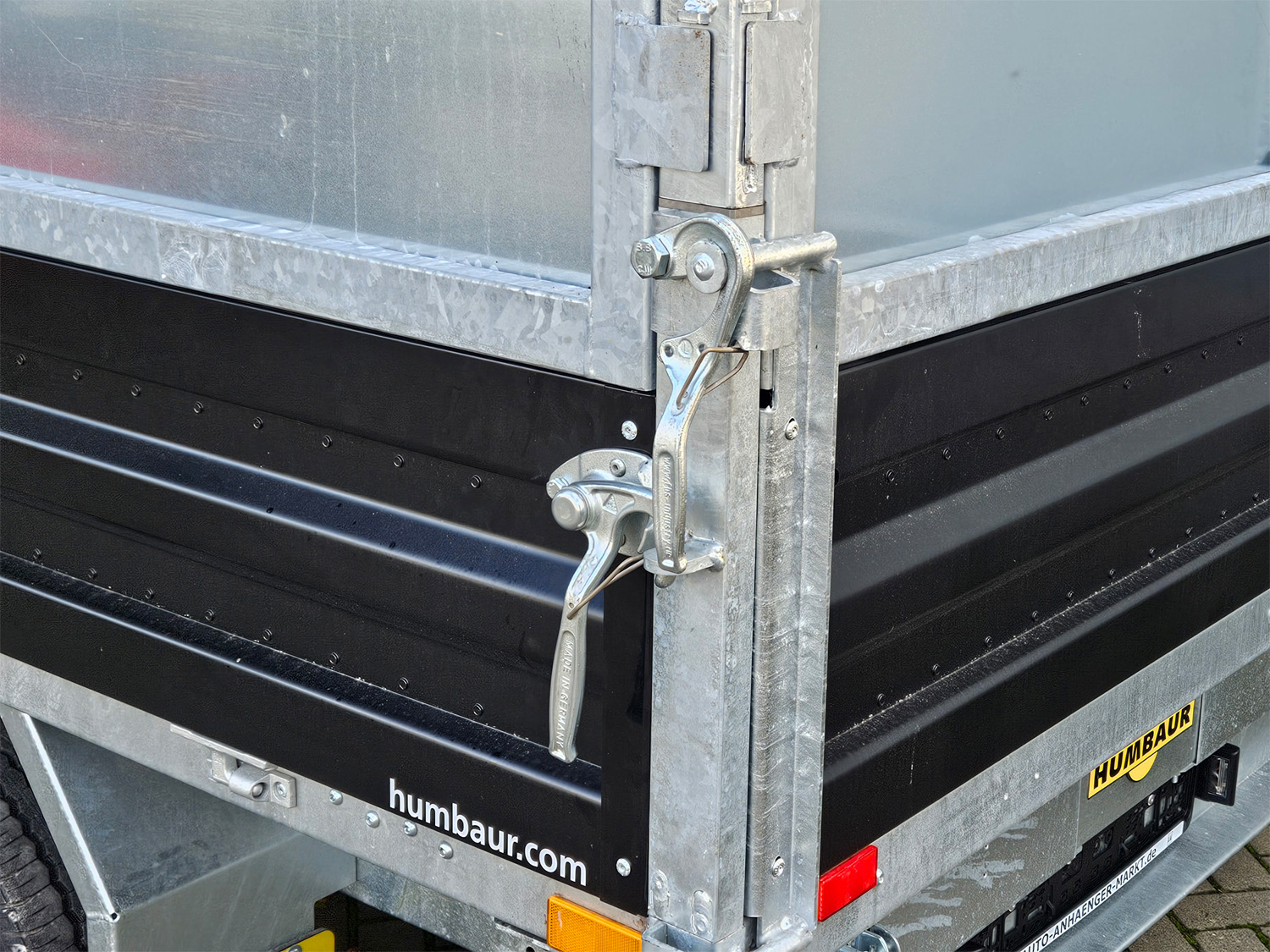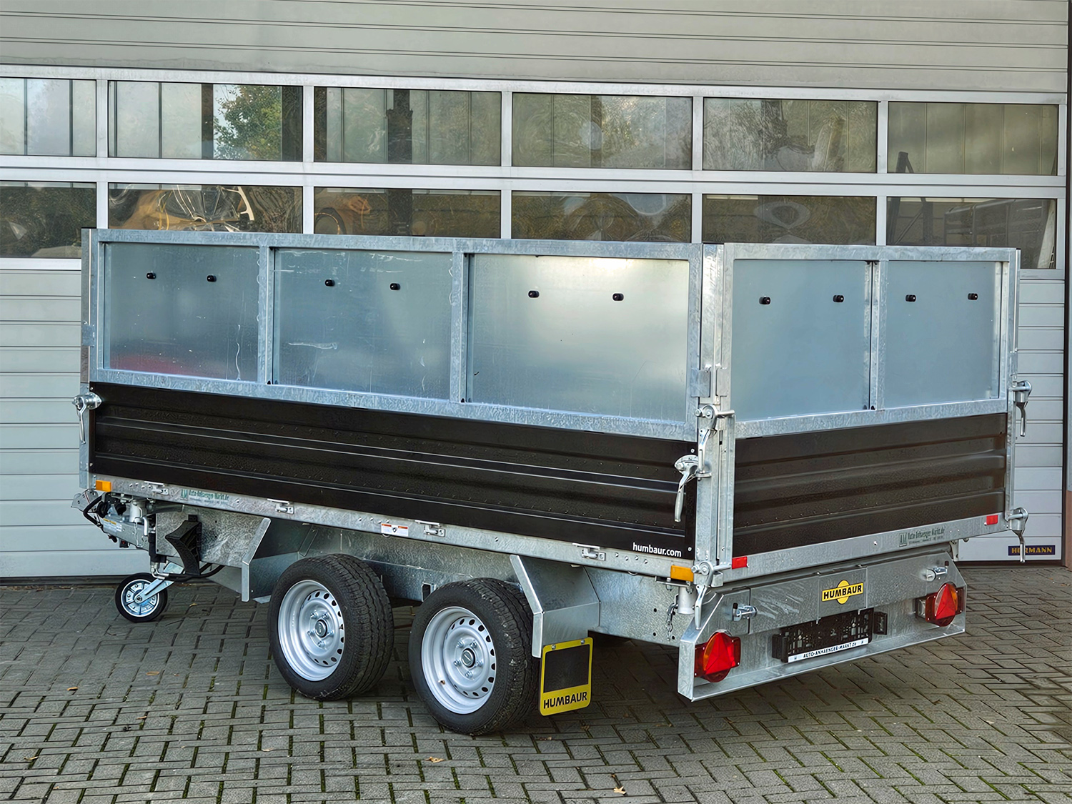Der Humbaur HTK 3000.31 STAHL ist ein robuster Dreiseitenkipper mit einer Stahlbordwand und einem 600 mm hohen pendelbaren Stahlblechaufsatz, der abnehmbar ist. Sein Fahrwerk, der Rahmen und die Kippbrücke sind tauchbadverzinkt und gewährleisten höchste Stabilität und Haltbarkeit. Die aus einem Stück gefertigte Stahl-Kippbrücke sorgt für zusätzliche Robustheit. Sechs im Brückenboden montierte Anbinderinge (je 800 kg Zugkraft) bieten eine sichere Ladungssicherung. Die hintere Klappe ist pendelbar für eine flexible Nutzung. Ein hochwertiger, hartverchromter 4-stufiger Qualitäts-Kippzylinder sowie eine leistungsstarke Hydraulikeinheit garantieren eine zuverlässige Kippfunktion. Der vormontierte Bohlenschacht dient als Vorbereitung für Alubohlen. Das Modell ist mit einer Elektro- und Handpumpe verfügbar, und der Kippwinkel beträgt ca. 45° nach hinten und seitlich. Rampen und Stützen sind gegen Aufpreis erhältlich.