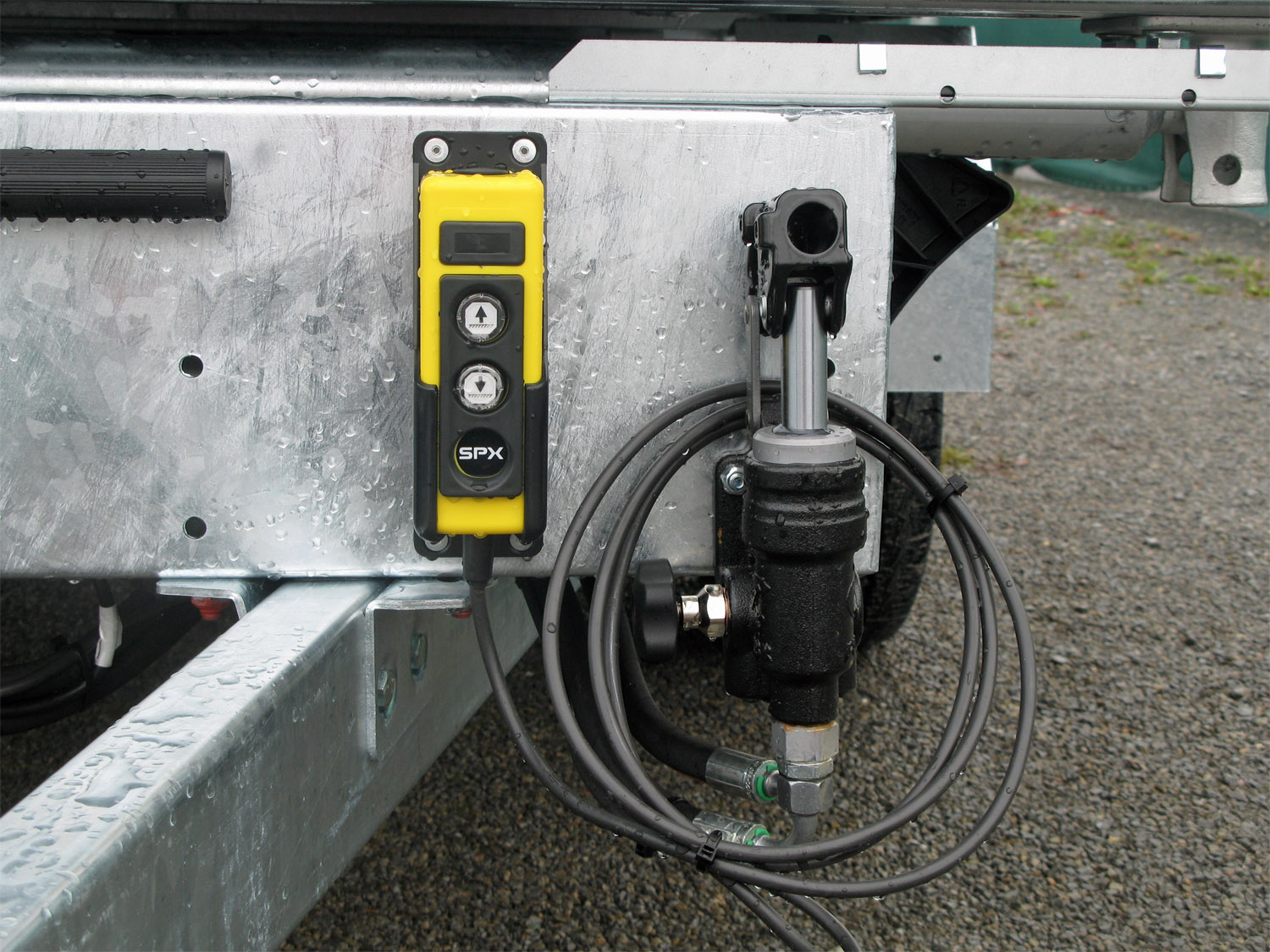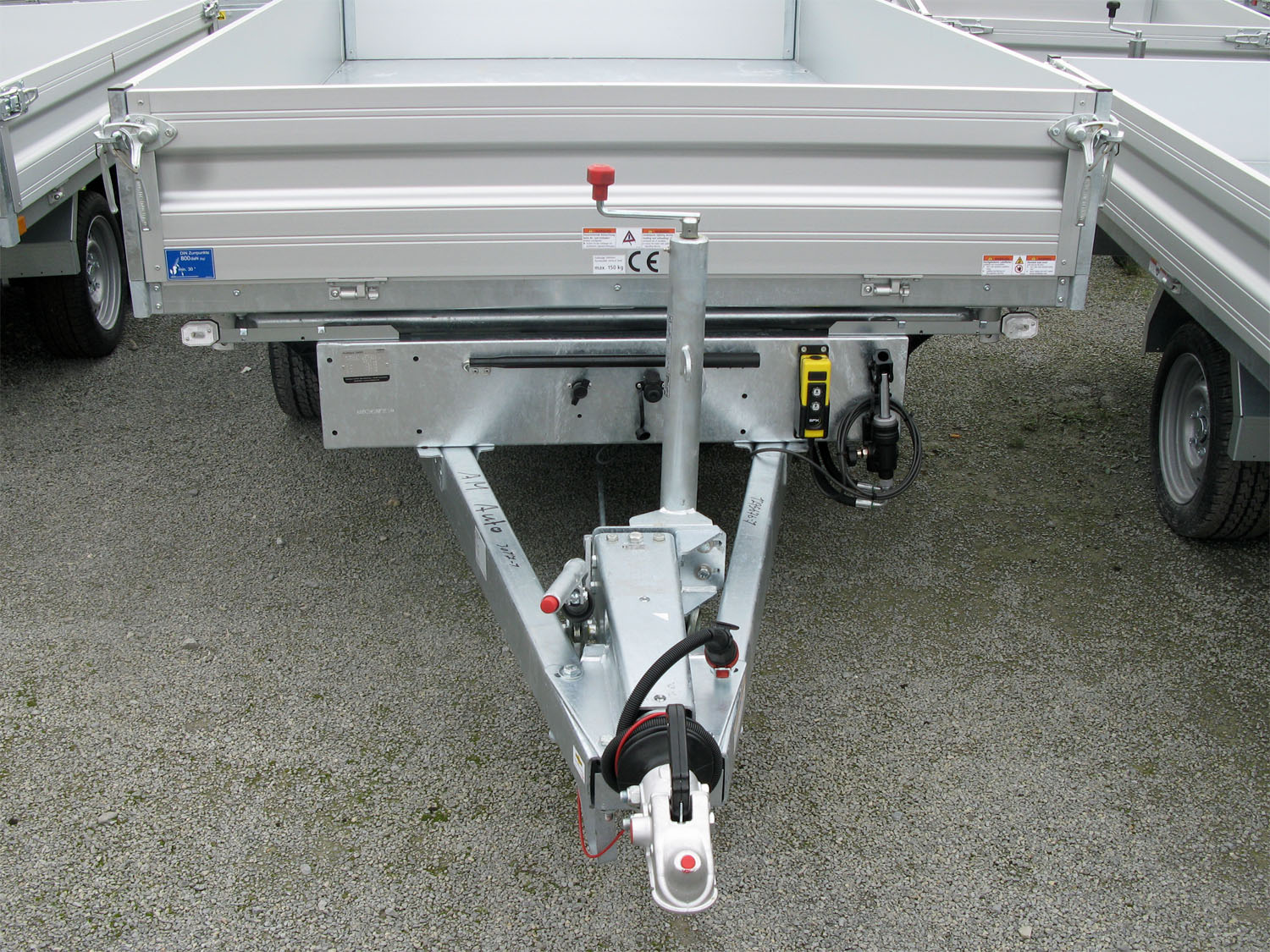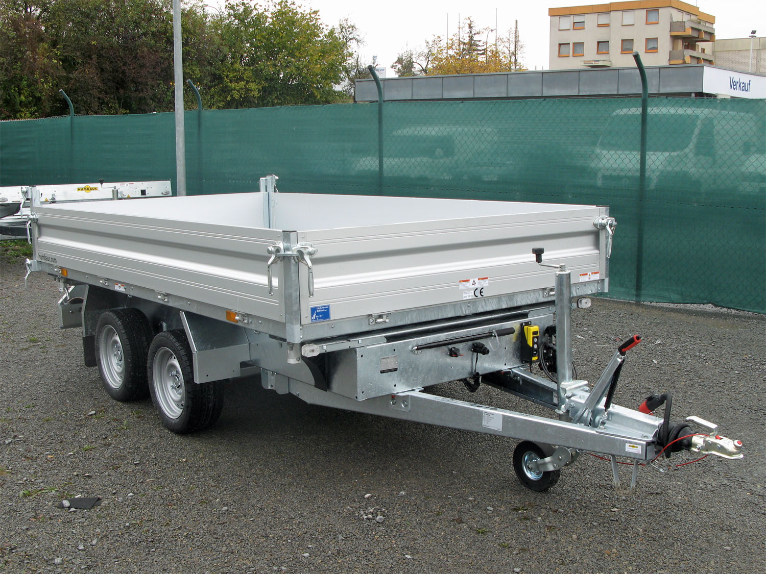 Der Humbaur HTK 3000.37 ALU ist ein robuster Dreiseitenkipper mit eloxierten Aluminium-Bordwänden und einem tauchbadverzinkten Fahrwerk für maximale Haltbarkeit. Die aus einem Stück gefertigte Stahl-Kippbrücke sorgt für eine hohe Stabilität und Langlebigkeit. Mit acht im Brückenboden montierten Anbinderingen (je 800 kg Zugkraft), einer hochwertigen Hydraulikeinheit und einem hartverchromten 4-stufigen Qualitäts-Kippzylinder bietet er eine zuverlässige Kippfunktion. Die Heckklappe ist pendelbar, und der Bohlenschacht ist vormontiert und als Vorbereitung für Alubohlen ausgelegt. Das Modell ist mit einer Elektro- und Handpumpe ausgestattet, und der Kippwinkel beträgt ca. 45° nach hinten und seitlich.