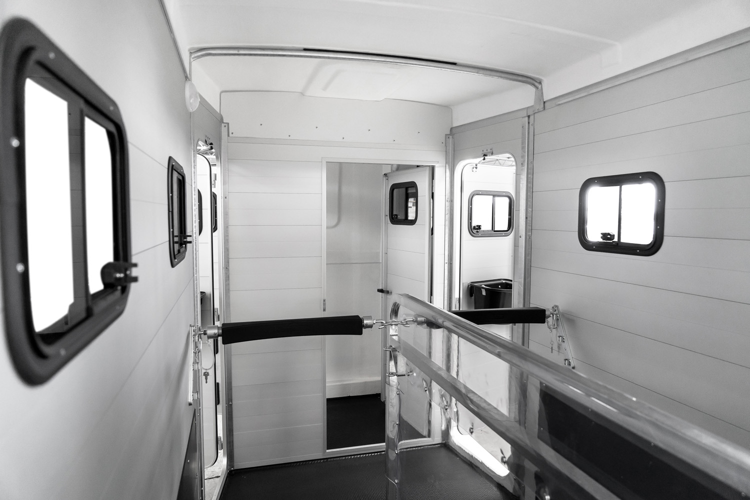 Der Humbaur Notos Xtra UP 2700 bietet außergewöhnlichen Komfort und maximalen Stauraum. Die größte begehbare Sattelkammer aller Notos-Xtra-Modelle ist mit einem klappbaren Sattelhalter, Trensenhalter, Spiegel, Netz, Innenbeleuchtung, Schaufel und Besen, Klappsitz und Stiefelknecht ausgestattet und sorgt für optimale Organisation. Das EquiDrive® PLUS S Fahrwerk mit Schraubenfederachsen und Radstoßdämpfern garantiert eine sichere Fahrt und perfekte Straßenlage. Die Konstruktion aus doppelwandigem, eloxierten Aluminiumprofil und feuerverzinkten Seitenwandabstützungen sorgt für maximale Stabilität und Langlebigkeit. Dank der geteilten, gepolsterten und höhenverstellbaren Brust- und Heckstangen mit Panikentriegelung, der dreh-/schwenkbaren Mittelpfostentrennwand, sowie des Seitentrittschutzes bietet der Anhänger höchste Sicherheit und Komfort für die Pferde. Die Mannshohe Einstiegstüre rechts zum Pferderaum und die Mannshohe Sattelkammertüre links mit Schiebefenster und 3-Punkt-Verriegelung ermöglichen einen einfachen Zugang. Weitere Ausstattungshighlights umfassen getönte Schiebefenster (je zwei links und rechts im Pferderaum), eine Polyhaube und Polybug in Silver Metallic, sowie ein Automatik-Stützrad mit Rangiergriff.