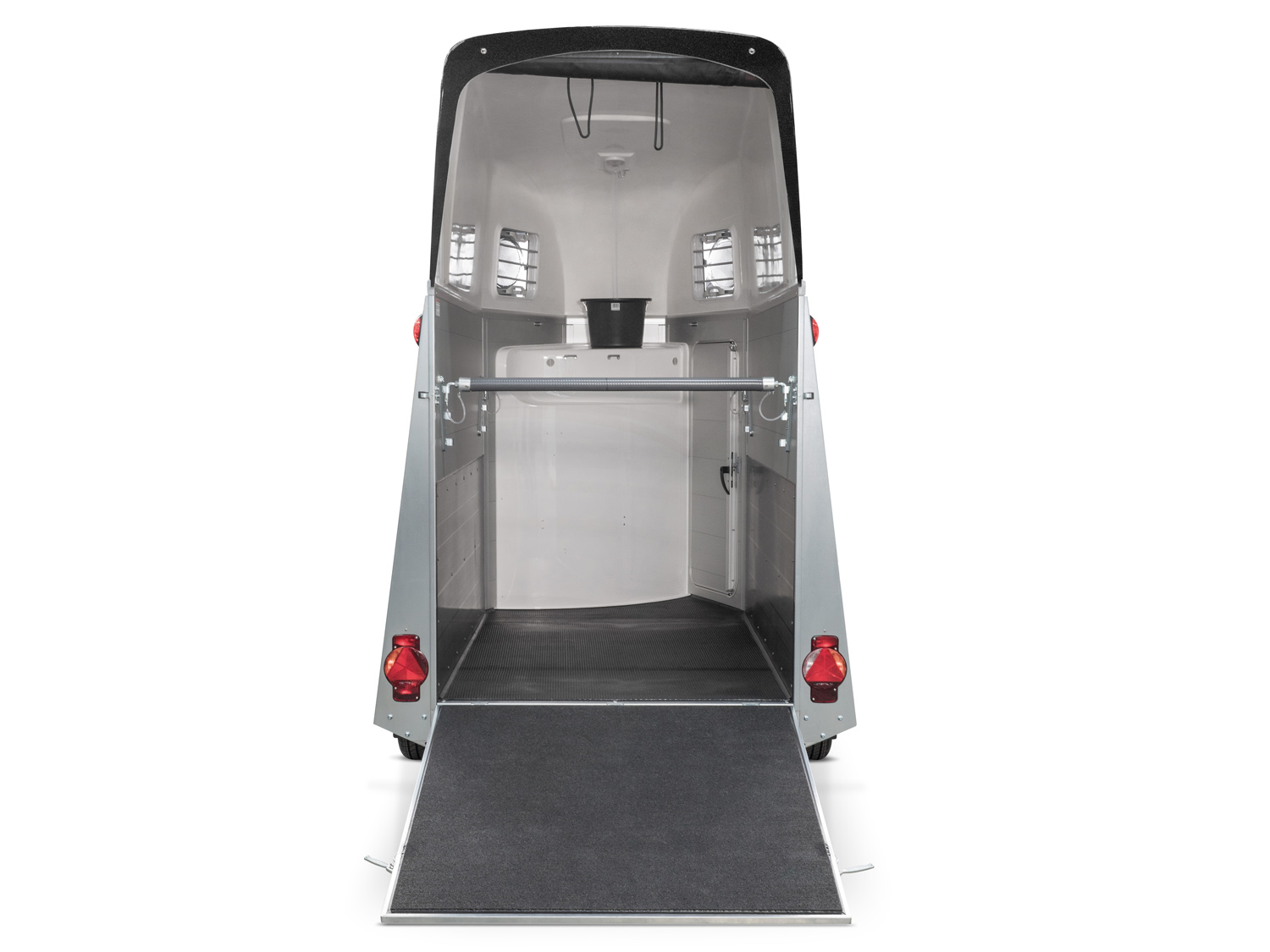 Der Humbaur Single Alu 1600 ist ein hochwertiger Pferdeanhänger mit kompaktem Design, ideal für den Transport von Stute und Fohlen. Dank des EquiDrive® Fahrwerks und der optionalen 100 km/h Zulassung (nur in Deutschland) bietet der Anhänger eine ruhige und sichere Fahrt. Die Konstruktion aus hochwertigen eloxierten Aluminiumprofilen (18 mm stark) sowie das massive, umlaufende und feuerverzinkte Rahmenprofil sorgen für maximale Robustheit und Korrosionsschutz. Die Brust- und Heckstange sind durchgehend höhen- und längenverstellbar und mit Panikentriegelung ausgestattet. Das exklusive Windschott ermöglicht eine zugfreie Innenraumbelüftung, während die getönten Ausstellfenster in der Polyhaube, die Innenbeleuchtung, und der Seitentrittschutz für zusätzlichen Komfort sorgen. Mit der Einstiegstüre mit 3-Punkt-Verriegelung, der Auflaufklappe mit Gummigranulatmatte, sowie der Polyhaube in Grau bietet dieser Anhänger eine durchdachte und langlebige Ausstattung.