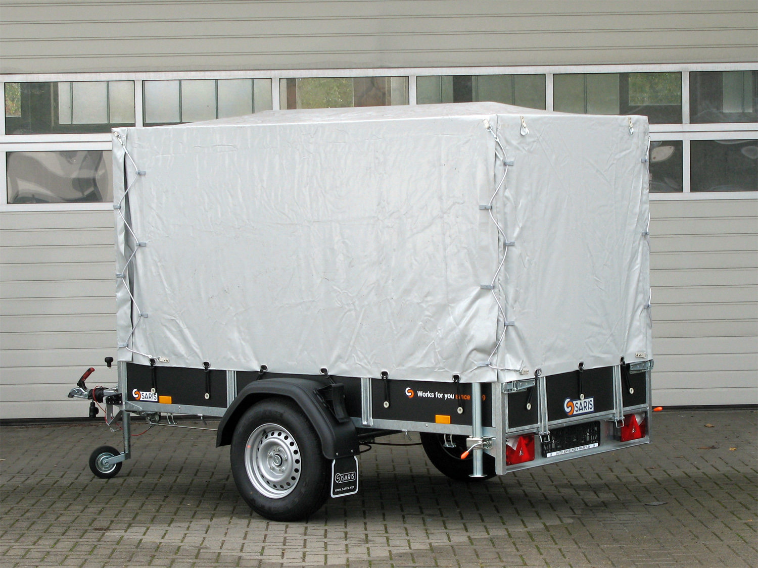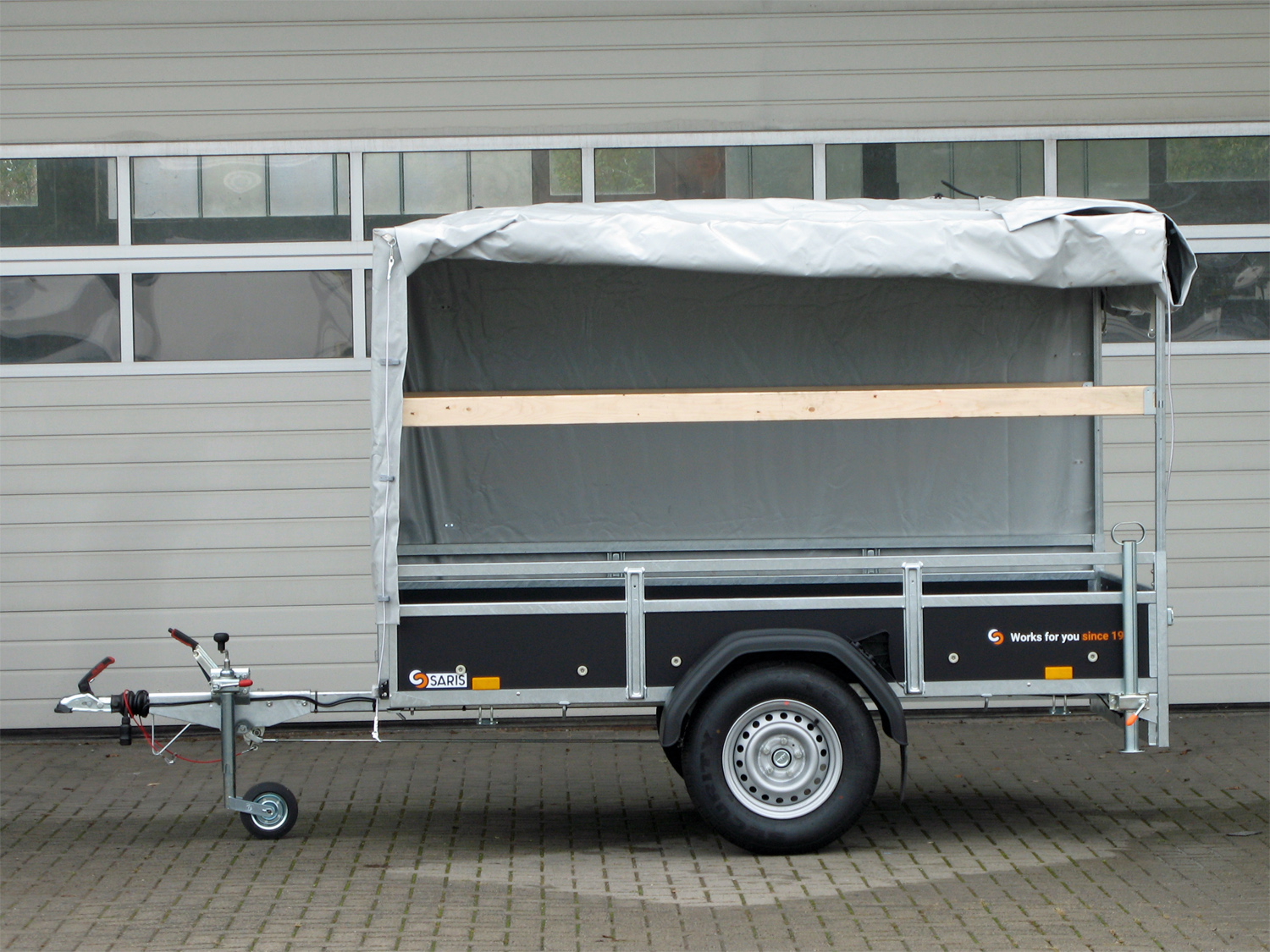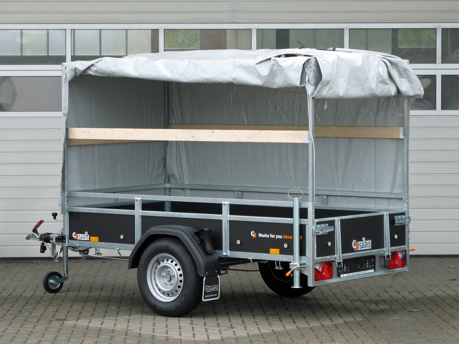 Der Saris CW 255 133 1350 1 ist mit einem Original-Saris-Planenaufbau in Grau ausgestattet, der 150 cm Höhe bietet und komplett montiert geliefert wird.