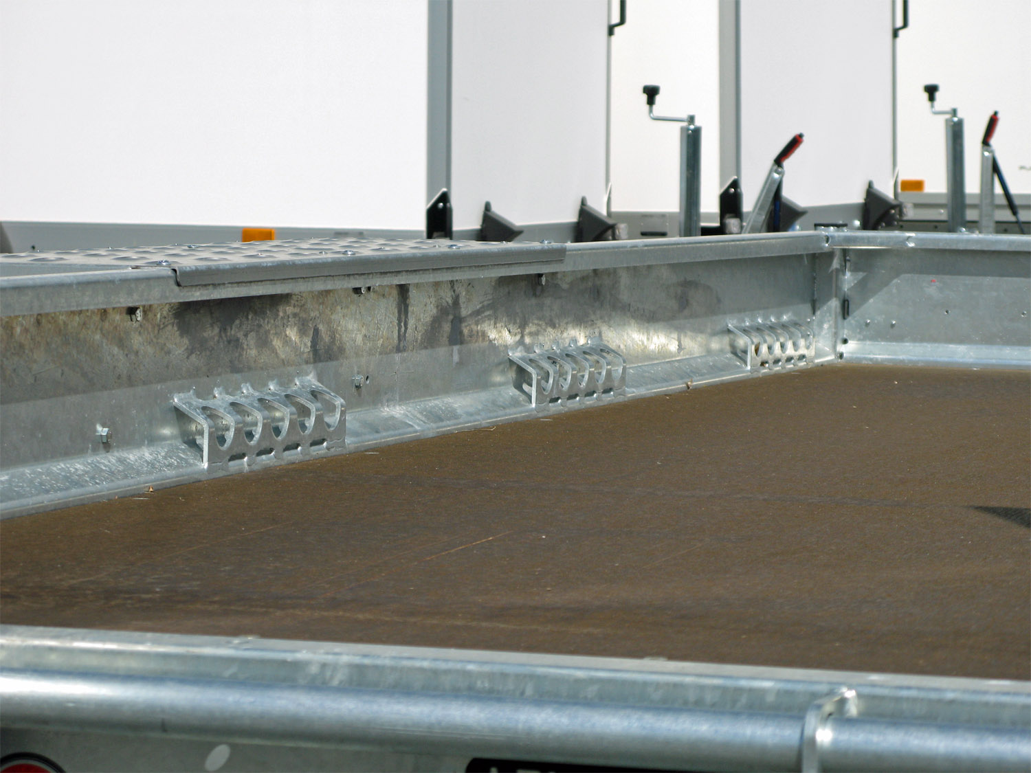 • 4 geschweißte Verzurrschienen mit je 1000 daN (geprüft nach DIN 75410-1) an den Seitenwänden