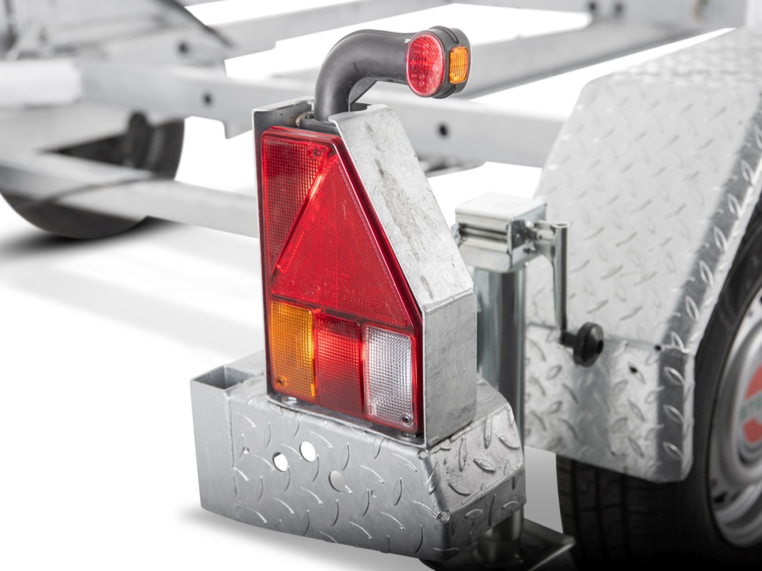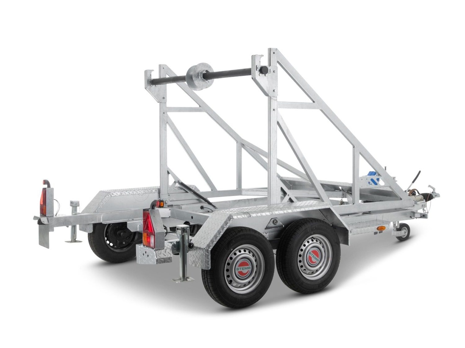 Der Stema KT O2 27-30-25.2 ist ein zuverlässiger Kabeltrommelanhänger mit moderner Multifunktionsbeleuchtung für optimale Sichtbarkeit. Er verfügt über einen Windenstand mit Seilwinde sowie montierte Unterlegkeile mit Halterung. Die begehbaren Stahlblech-Kotflügel erleichtern das Auf- und Absteigen. Das Fahrgestell besteht aus einer geschweißten und feuerverzinkten Rahmenkonstruktion mit V-Deichsel und Teleskopkurbelstützen für zusätzliche Stabilität. Die Kippbrücken sind aus massiven, geschweißten und feuerverzinkten Stahlprofilen gefertigt und sorgen für eine hohe Belastbarkeit. Ein Stützrad ist ebenfalls enthalten, um einen sicheren Stand zu gewährleisten.