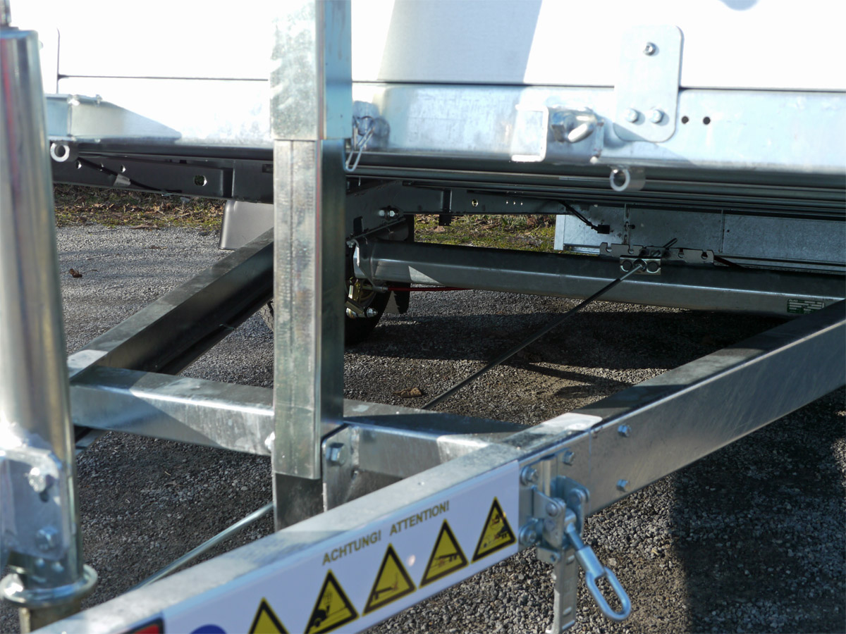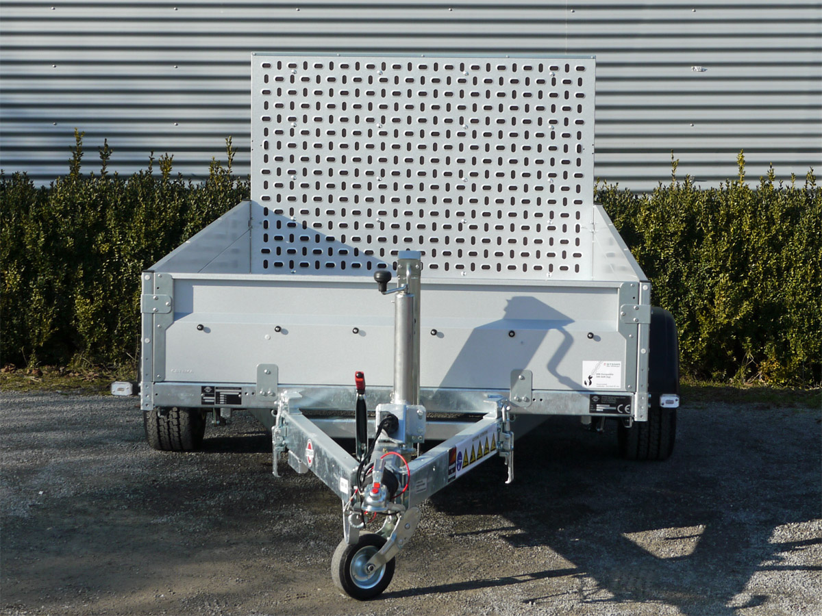 Für optimale Haltbarkeit ist das Fahrgestell und die Kippbrücke aus einer feuerverzinkten Schraub-Schweißkonstruktion gefertigt. Die soliden Bordwände mit GALVALUME-Beschichtung bieten doppelten Korrosionsschutz, während die stabile Sicherheits-V-Deichsel eine ausgezeichnete Straßenlage gewährleistet. Weitere Highlights sind die robuste Gummifederachse mit Einzelradaufhängung, das wartungsfreie Kompaktradlager sowie die rutschhemmende, wasserfeste Siebdruckholzplatte als Bodenbelag.