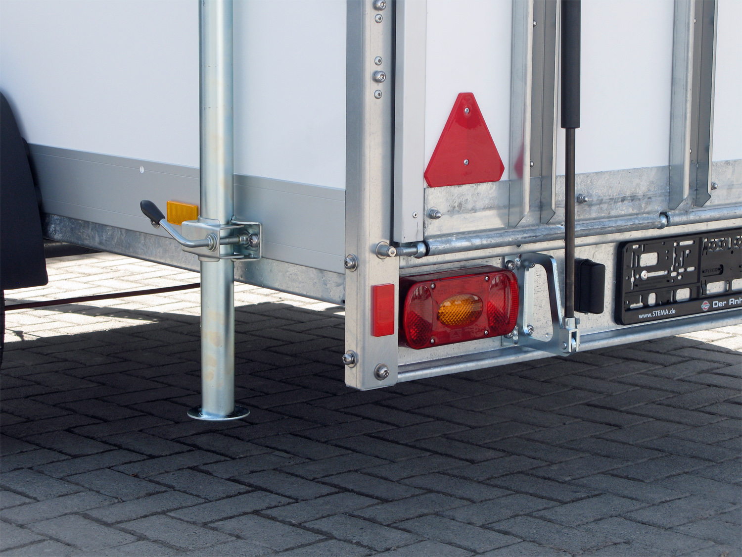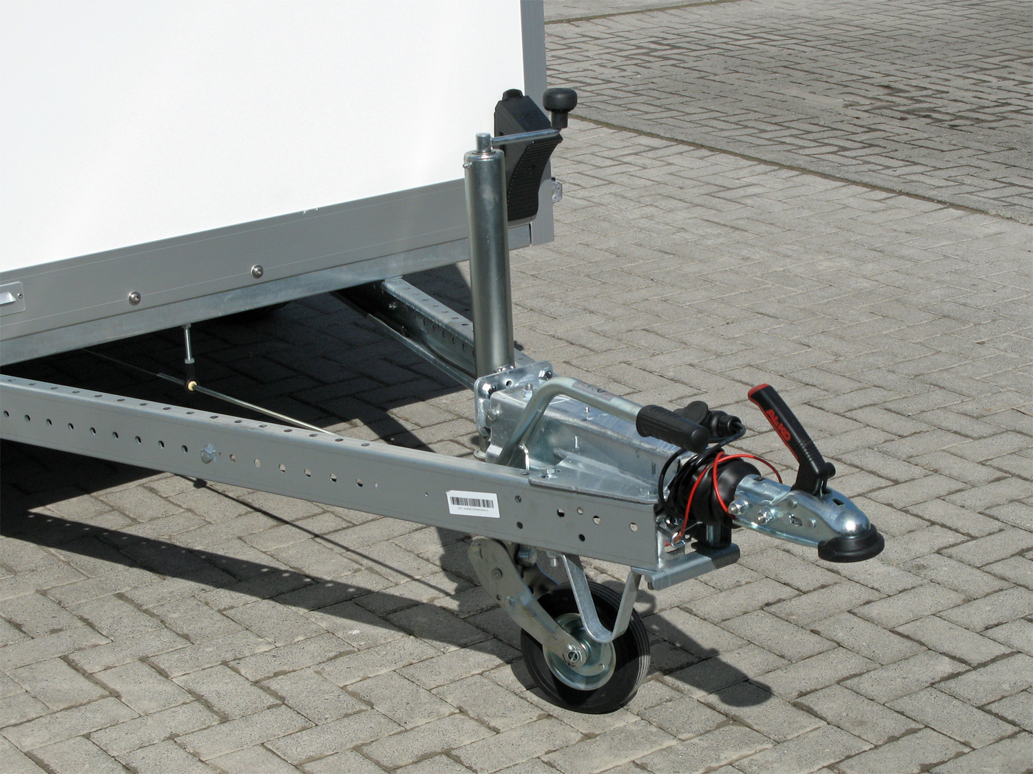 Die Konstruktion umfasst eine feuerverzinkte Zugkugelkupplung mit Sicherheitsanzeige, ein geschweißtes Fahrgestell, ein Stützrad, sowie einen Kennzeichenträger mit Rahmen und Leiste. Der abschließbare Drehstangenverschluss sorgt für zusätzliche Sicherheit.