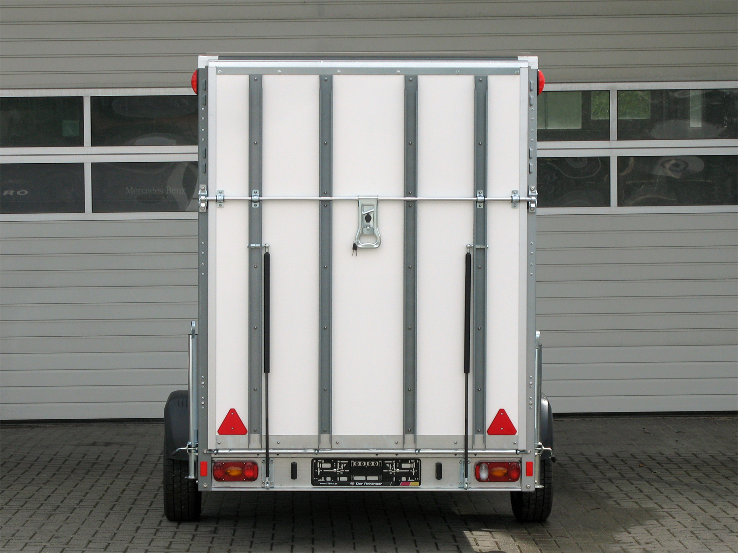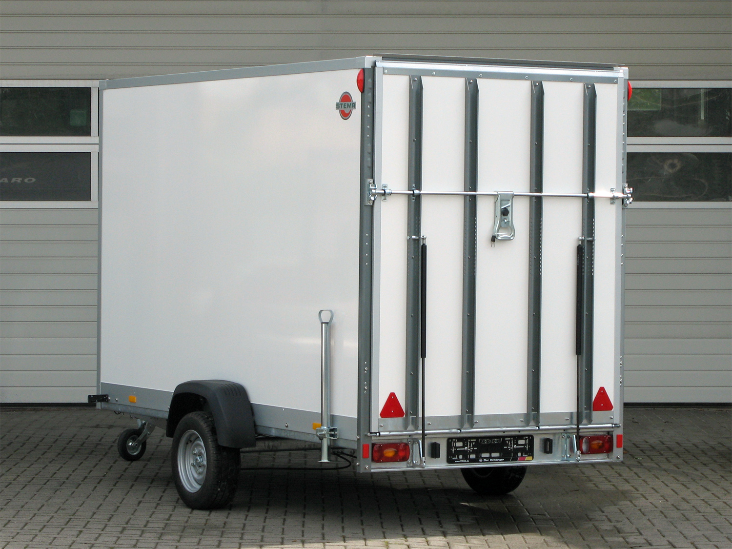 Die Konstruktion umfasst eine feuerverzinkte Zugkugelkupplung mit Sicherheitsanzeige, ein geschweißtes Fahrgestell, ein Stützrad sowie einen Kennzeichenträger mit Rahmen und Leiste.