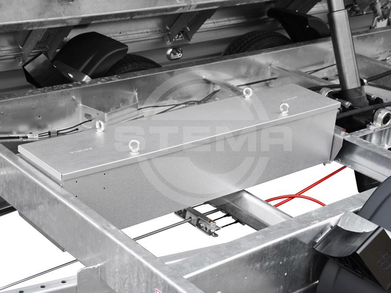 Der STEMA SHDK 35-36-20.2B TRIUS ALU ist ein Tandem-Hochlader mit einer V-Deichsel und Aluminium-Bordwänden. Er verfügt über eine Elektropumpe und einen hartverchromten 3-stufigen Teleskopzylinder für eine zuverlässige Kippfunktion. Der Grundrahmen (Fahrgestell) und die Kippbrücke bestehen aus massiven, verschweißten Stahlprofilen und sind vollständig im Tauchbad feuerverzinkt für maximale Langlebigkeit. Die Ladefläche besteht aus verzinktem Stahlblech und ist mit drei zusätzlichen Längsträgern ausgestattet, um eine optimale Lastverteilung zu gewährleisten. Bis zu acht versenkte Schwerlast-Zurringe (Zugkraft je 800 daN, DEKRA geprüft) sind im Brückenboden montiert, und die Bordwände sind allseitig abklapp- und abnehmbar. Die pendelbare Rückwand mit erhöhten Eckrungen ermöglicht eine größere Durchgangshöhe beim Entladen. Zur Ausstattung gehören zudem eine Auflaufbremse, ein Automatik-Stützrad, eine moderne Multifunktionsbeleuchtung mit Rückfahrscheinwerfer, zwei Unterlegkeile mit Halterung und eine Service-Stütze für zusätzliche Stabilität.