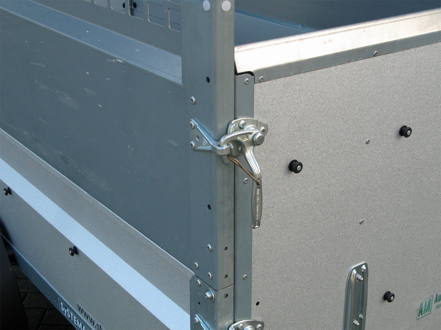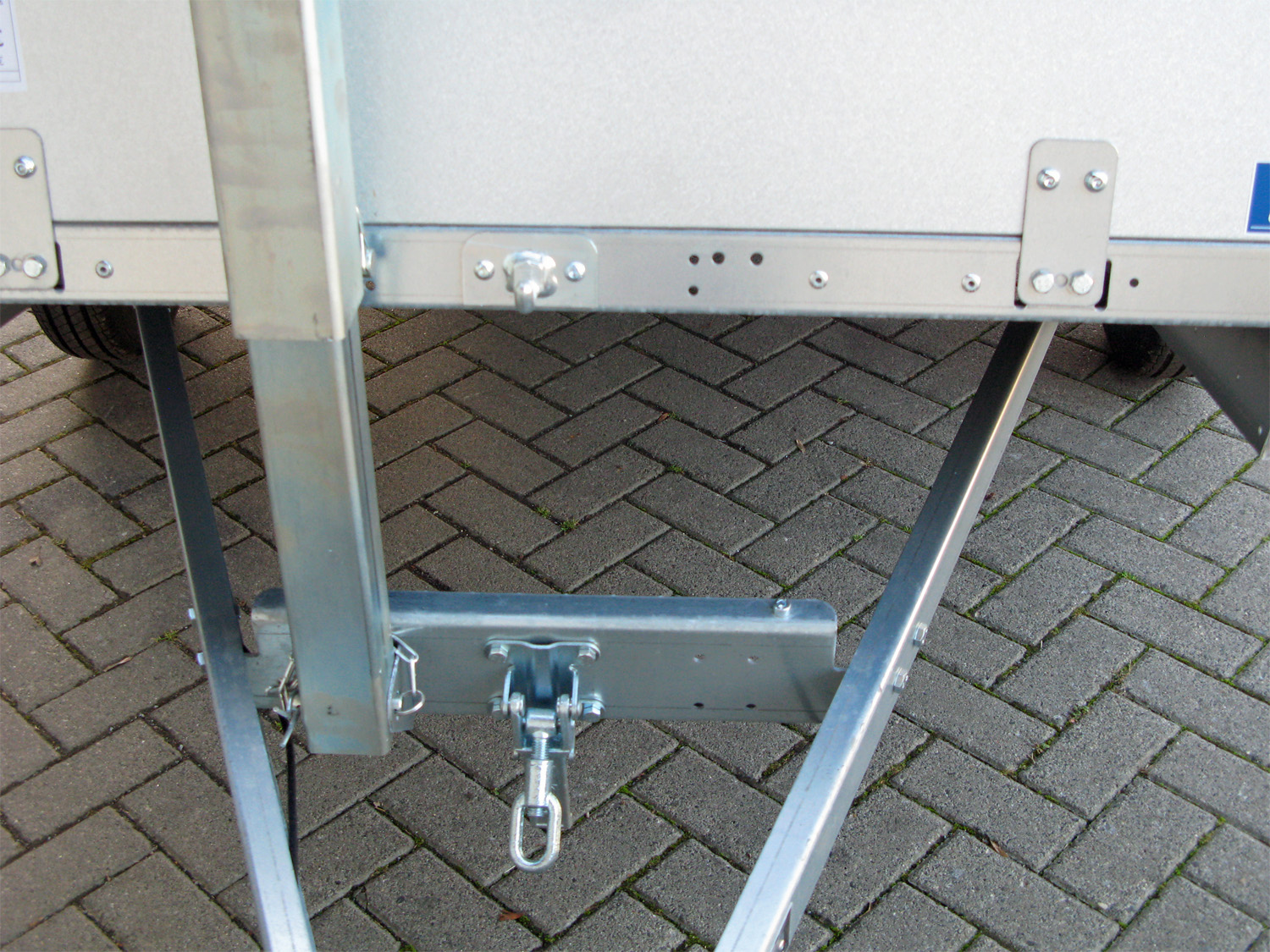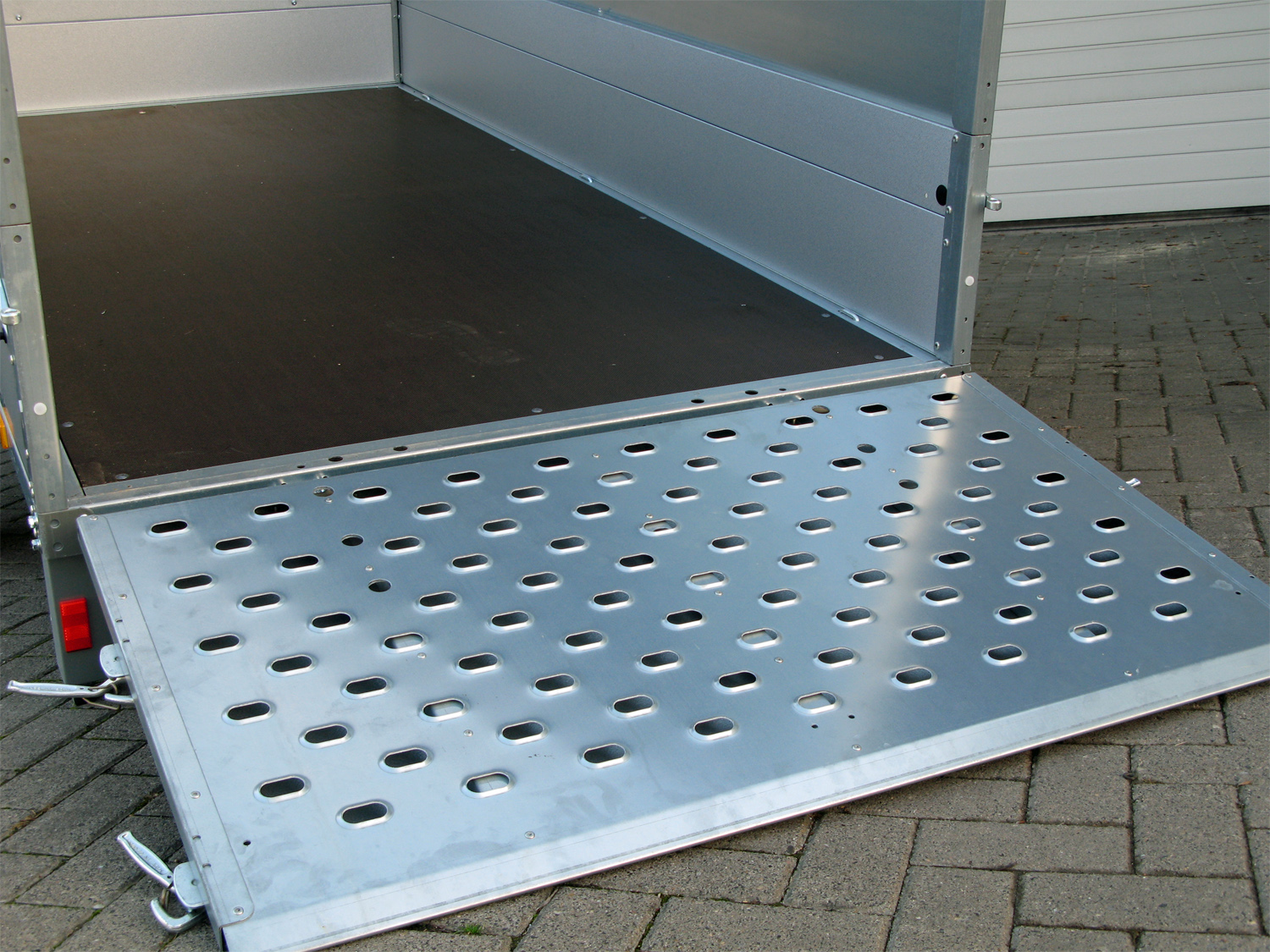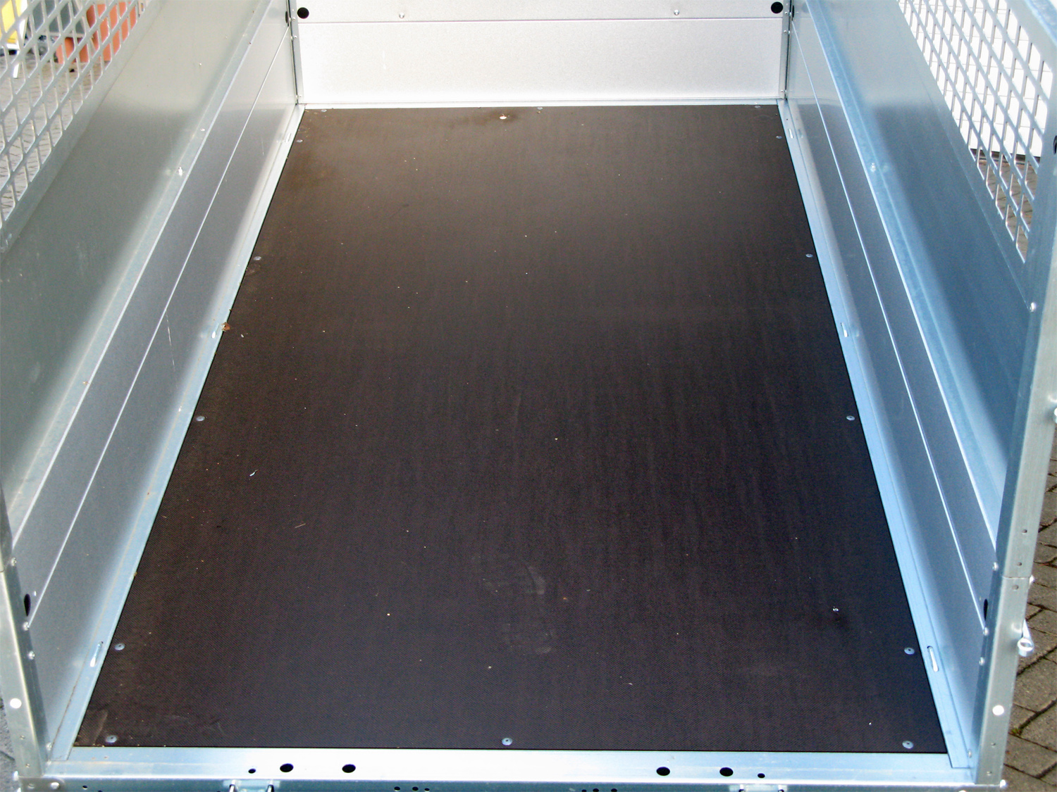 Ein zusätzliches Gitteraufsatz (66 cm Höhe) bietet erweiterten Schutz und sichert die Ladung effektiv. Der Anhänger ist mit einem Sicherungsspannverschluss für den Ladeboden, einem extra dicken, phenolharzbeschichteten Ladeboden für hohe Widerstandsfähigkeit sowie sechs stabilen, versenkbaren Verzurrösen ausgestattet.