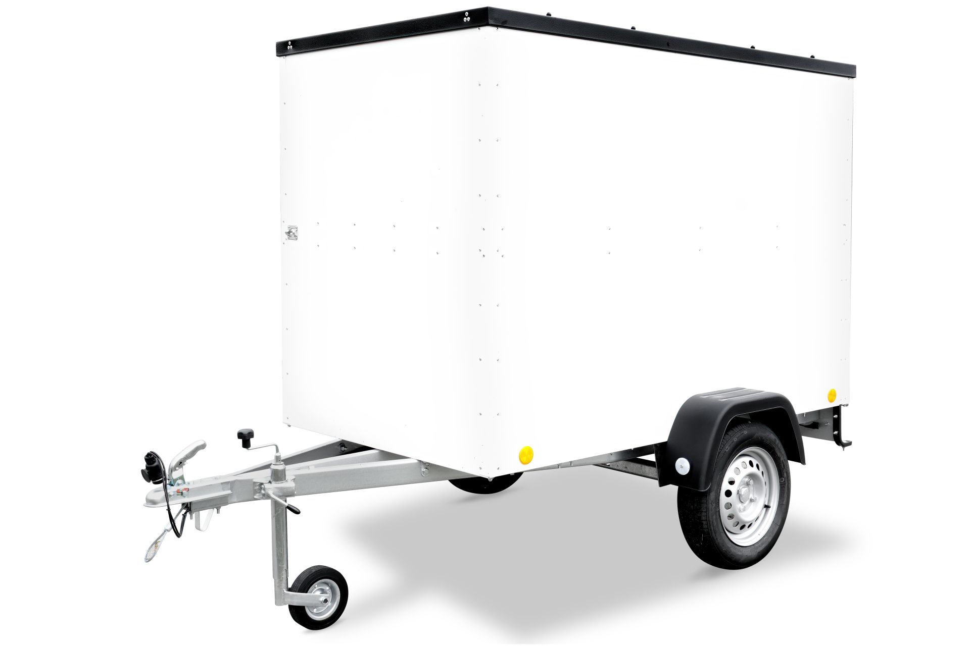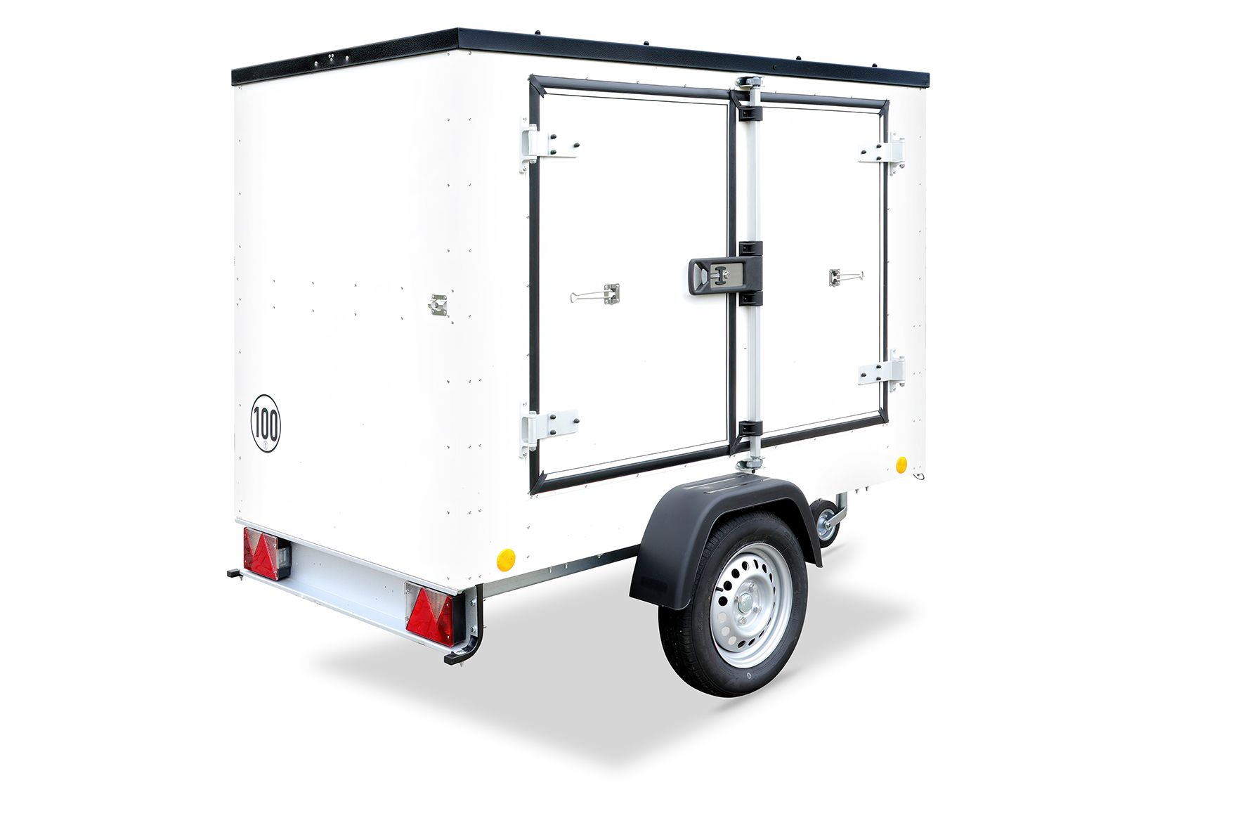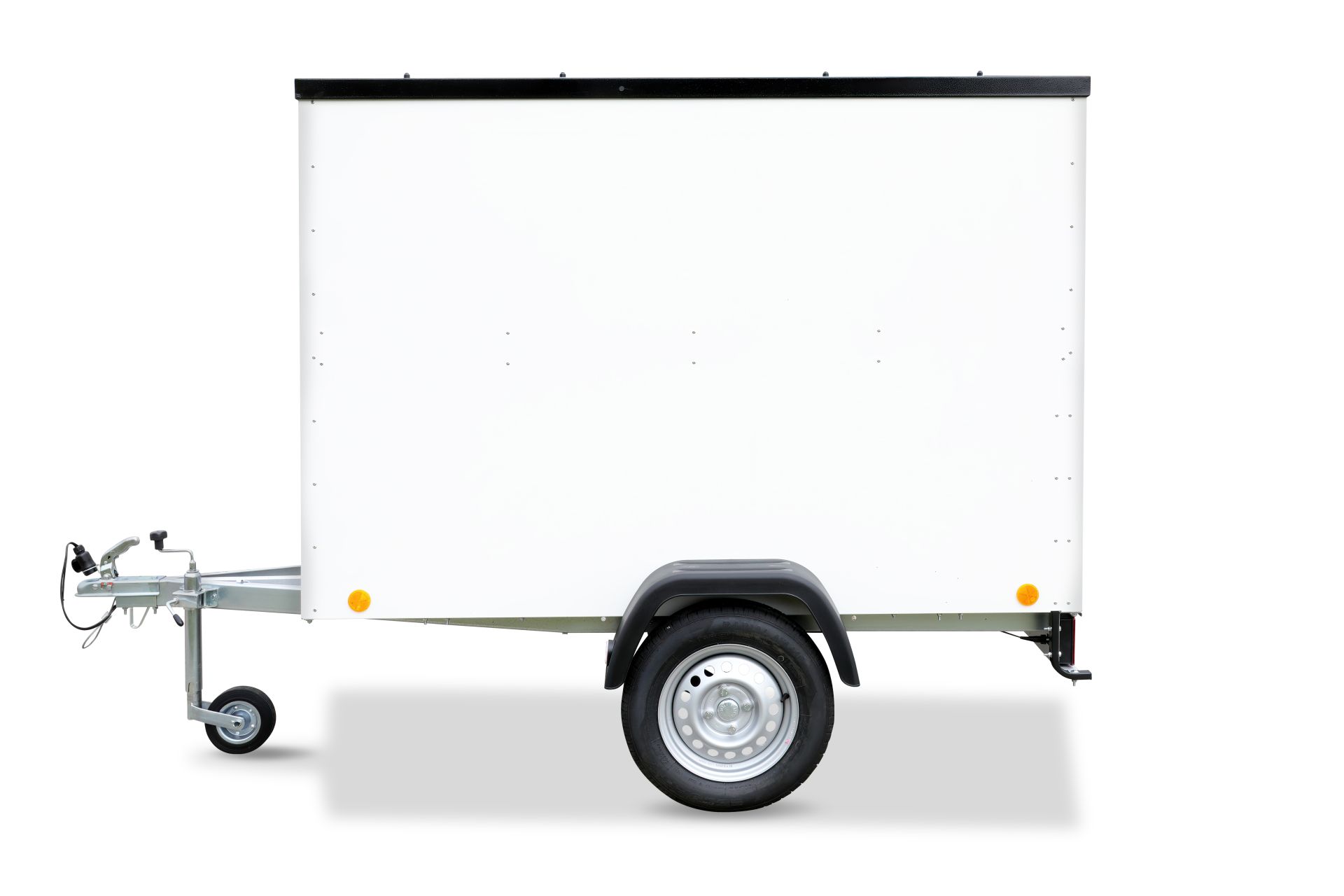 Der TPV Kofferanhänger KT-EB2 ist ein einachsiger, gebremster Verkaufsanhänger mit einer Zulässigen Gesamtmasse von 1000 kg. Die Doppelflügeltür rechts aus Plywood kann um 180 Grad geöffnet werden und ermöglicht die Montage von Prospektständern oder kleinen Regalen. Der Innenraum ist frei gestaltbar und kann individuell ausgebaut werden.
