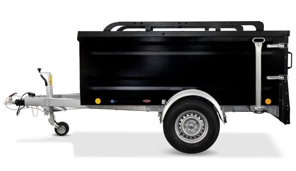 Dank seiner stabilen Konstruktion und der schwarz pulverbeschichteten Oberfläche bietet der Anhänger eine hohe Widerstandsfähigkeit und eine ansprechende Optik. Die verstärkten Kotflügel sind begehbar, und die Aluminium-Zink-beschichteten Seitenwände sorgen für zusätzliche Robustheit.