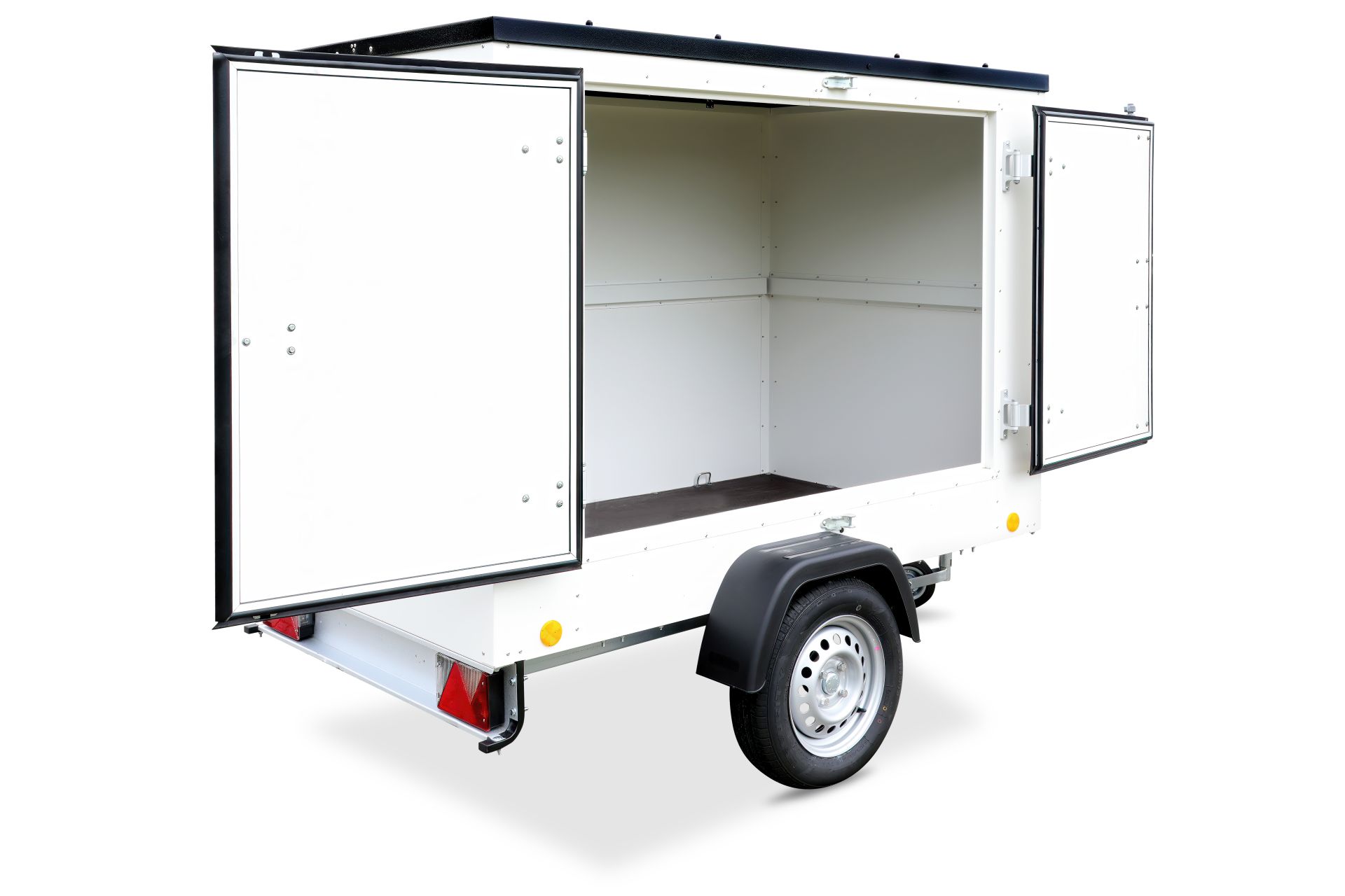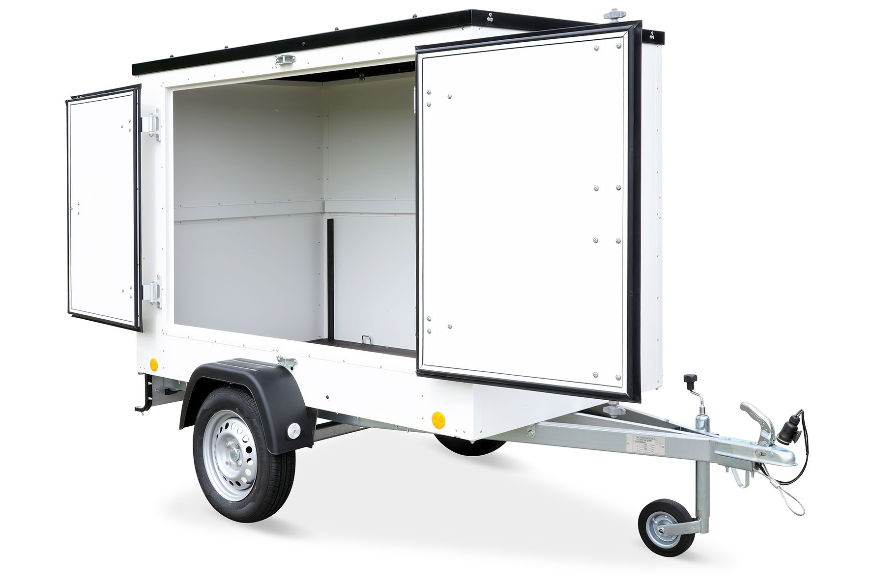 Der TPV Kofferanhänger KT-EU2 ist ein einachsiger, ungebremster Verkaufsanhänger mit einer Zulässigen Gesamtmasse von 750 kg. Die Doppelflügeltür rechts aus Plywood kann um 180 Grad geöffnet werden und ermöglicht die Montage von Prospektständern oder kleinen Regalen. Der Innenraum ist frei gestaltbar und kann individuell ausgebaut werden.