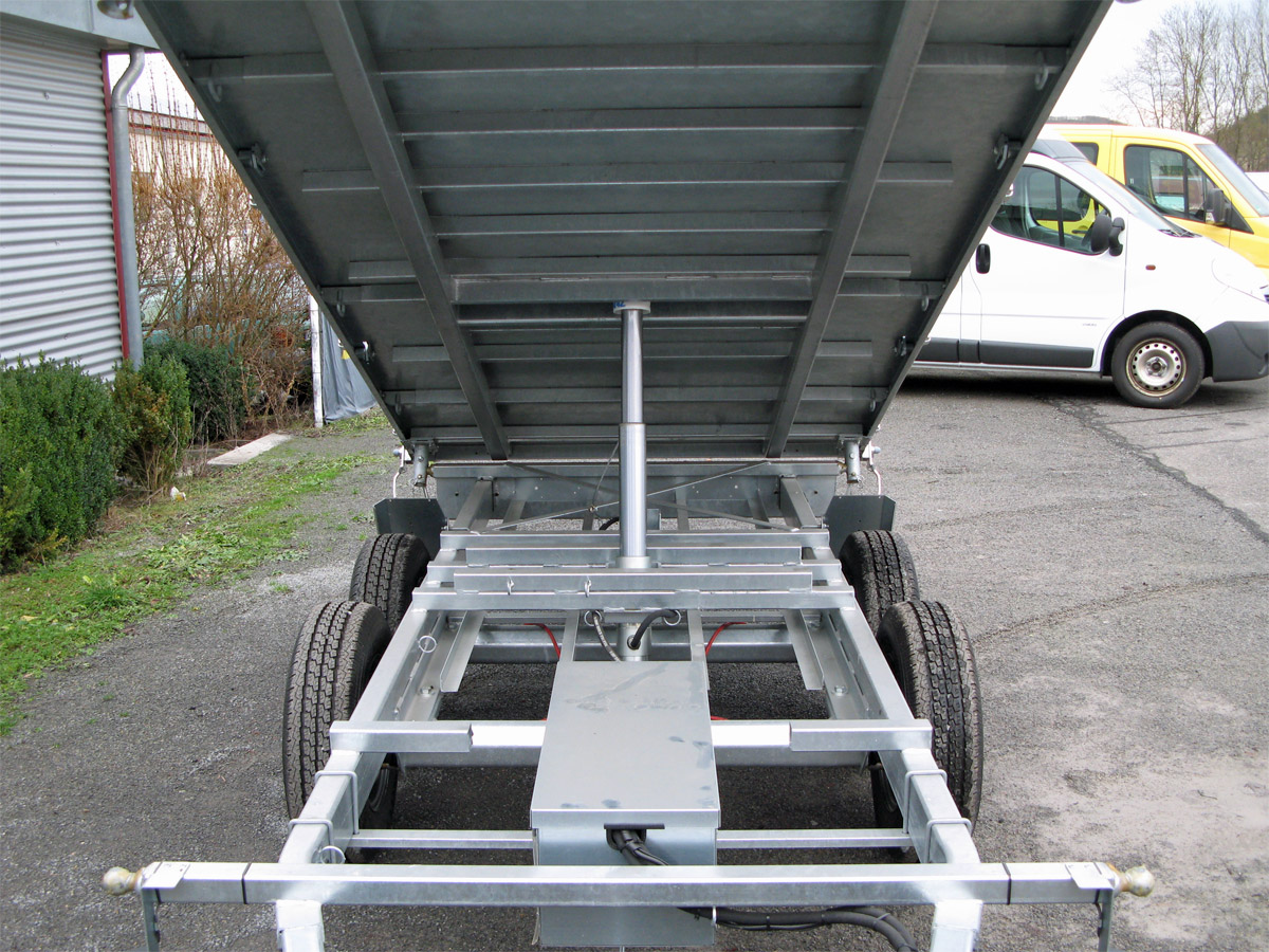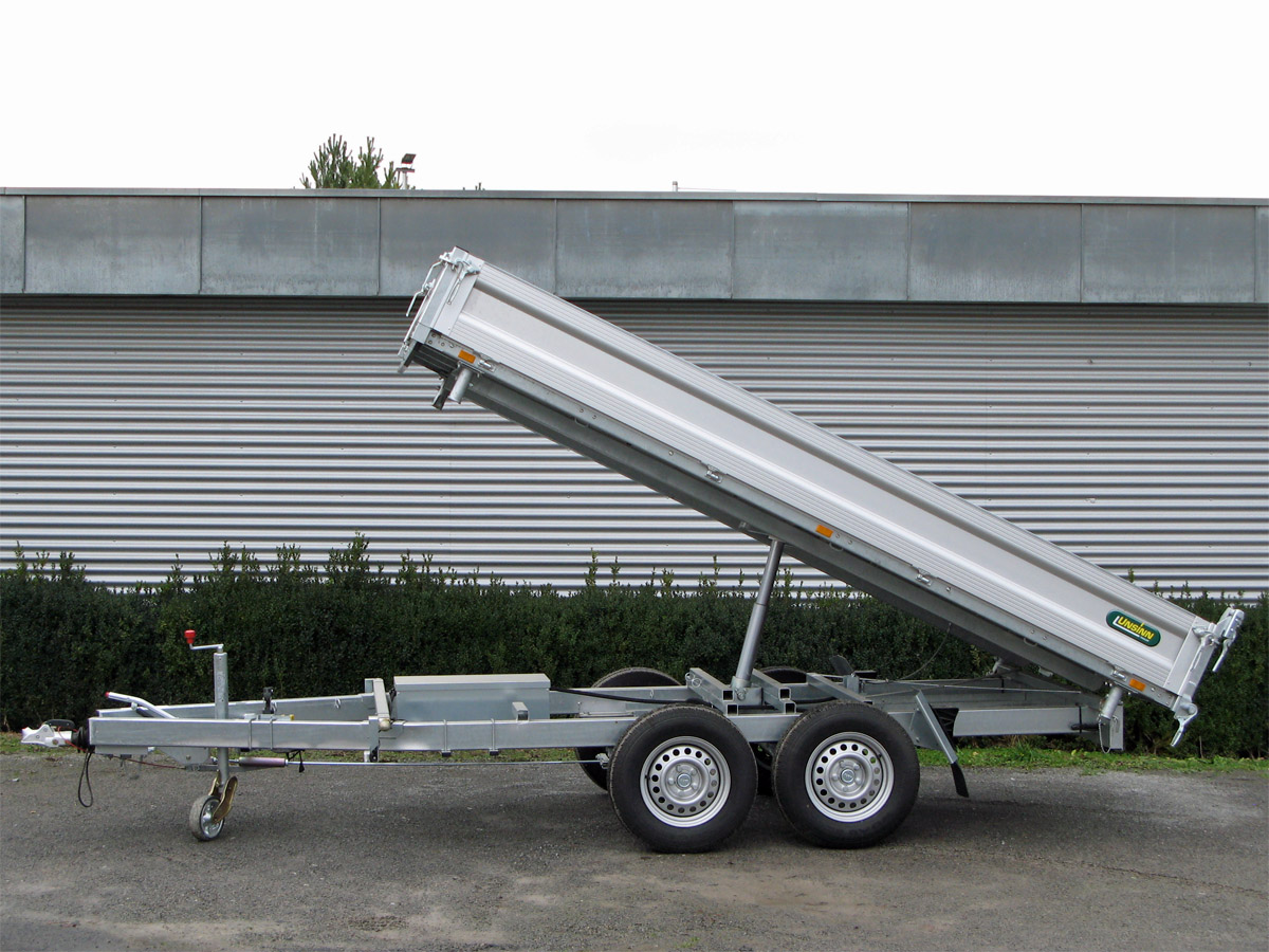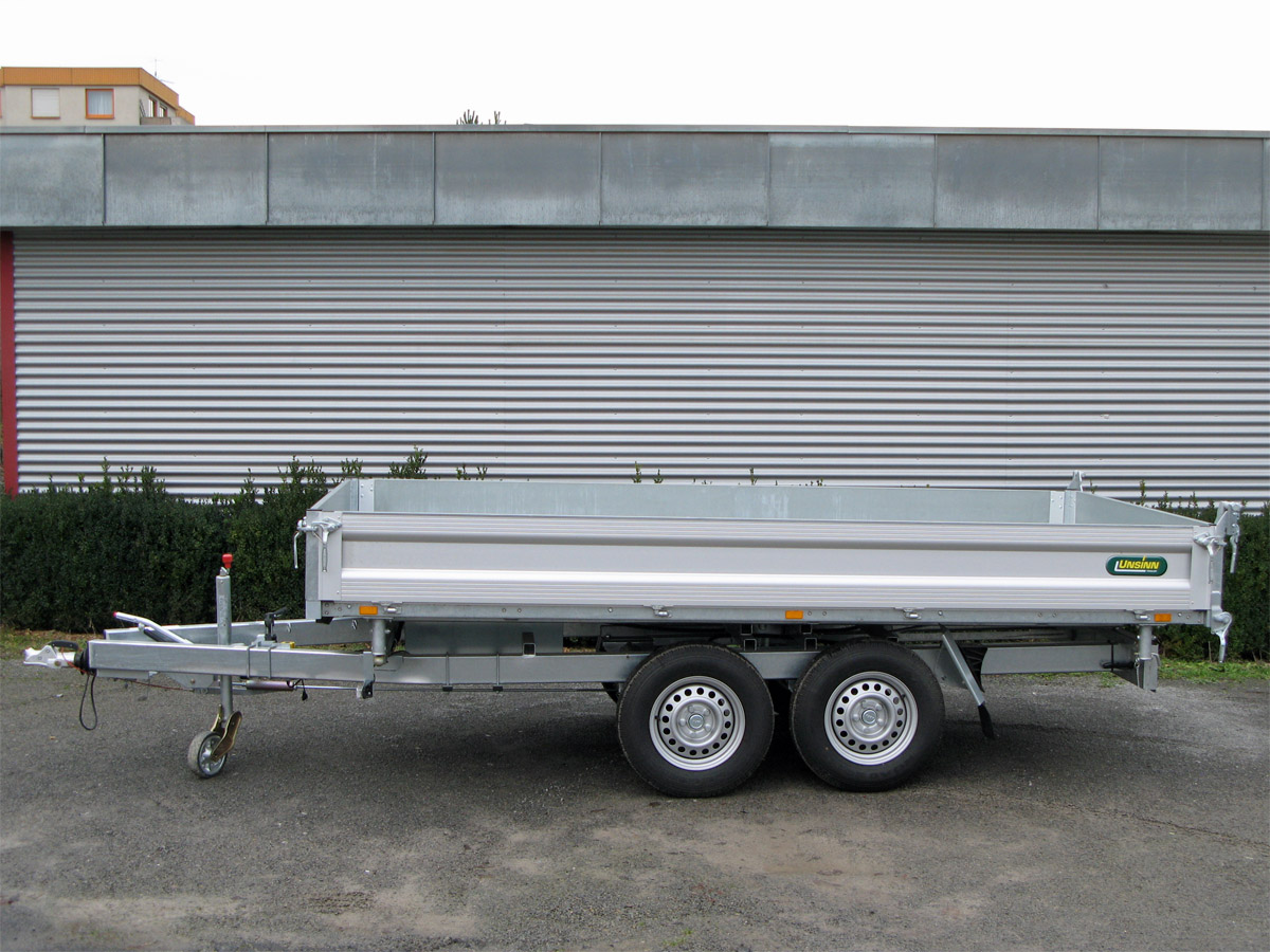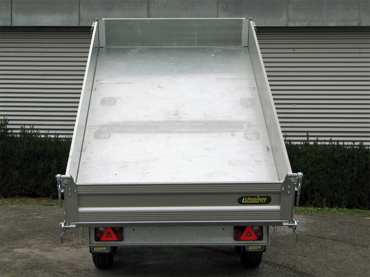 Der Unsinn UDK 3017-26-13 ist ein robuster 3-Seiten-Kipper mit einer hochwertigen Ausstattung für maximale Stabilität und Sicherheit. Die E-Hydraulik wird von einer Batterie gespeist und verfügt über ein Ladegerät sowie eine Notpumpe „Pumpless“ für Akkuschrauber. Ein klappbarer Kennzeichenhalter ermöglicht die praktische Verstauung der Auffahrschienen unter der Ladefläche. Das verwindungssteife Längsträgerfahrgestell mit Hohlprofilkonstruktion ist vollständig verschweißt und im Tauchbad feuerverzinkt. Zudem ist die Halterung für Auffahrschienen bereits vorbereitet. Das verstärkte Automatikstützrad bietet eine Tragkraft von 500 kg, während das Spinlock-Ladungssicherungssystem mit Topfmagnet und 10 versenkten Zurrpins (Zugkraft je 1.500 kg) eine sichere Ladungssicherung gewährleistet. Die Aluminium-Hohlprofil-Bordwände sind eloxiert, vierseitig abklappbar und mit Hakenverschlüssen versehen. Die Heckbordwand ist abklappbar und mit einer Stahlbeplankung ausgestattet. Vier steckbare Stahleckrungen sorgen für zusätzliche Belastbarkeit, und die Ladefläche besteht aus einem 3 mm starken Stahlboden. Zur weiteren Ausstattung gehören eine moderne Beleuchtung mit 13-poligem Stecker und Rückfahrscheinwerfer für optimale Sichtbarkeit.
