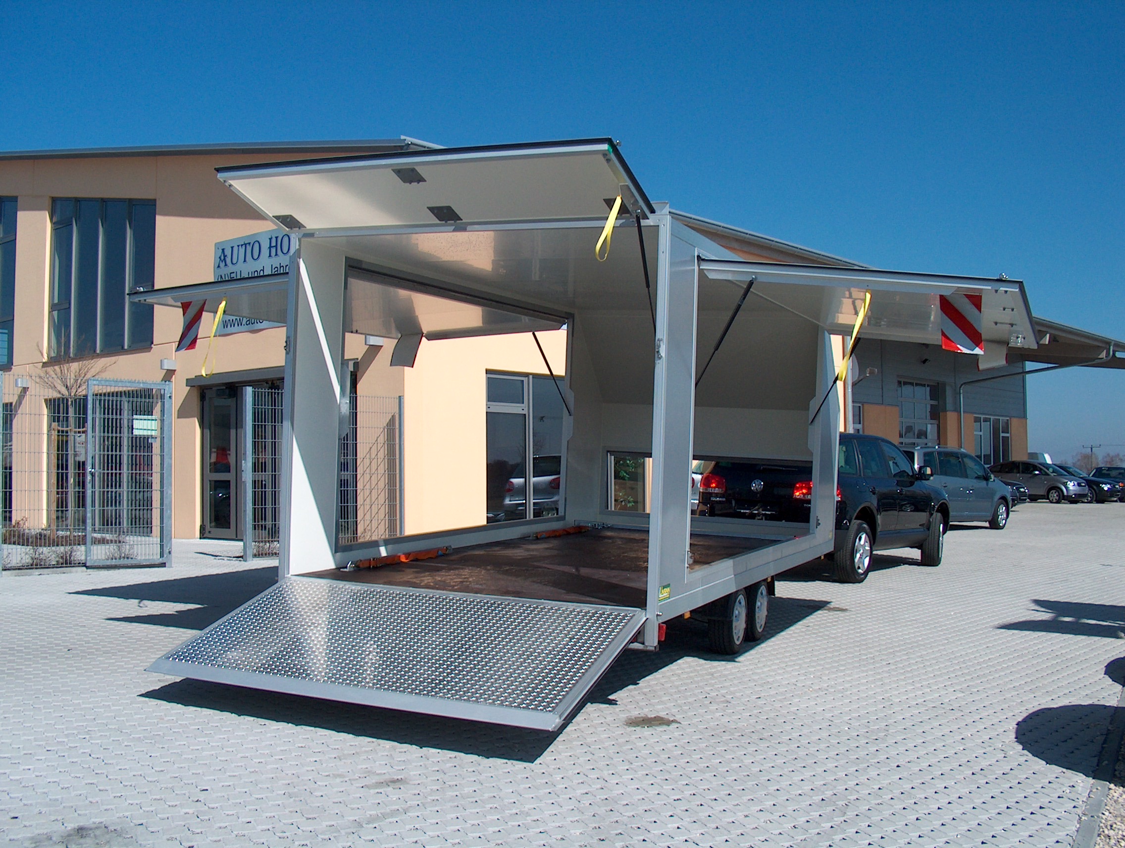 - Klappen: Stirnwandklappe (2300 x 600 mm), Seitenklappen (4000 x 1800 mm), Heckklappe mit Gasfederhubhilfe