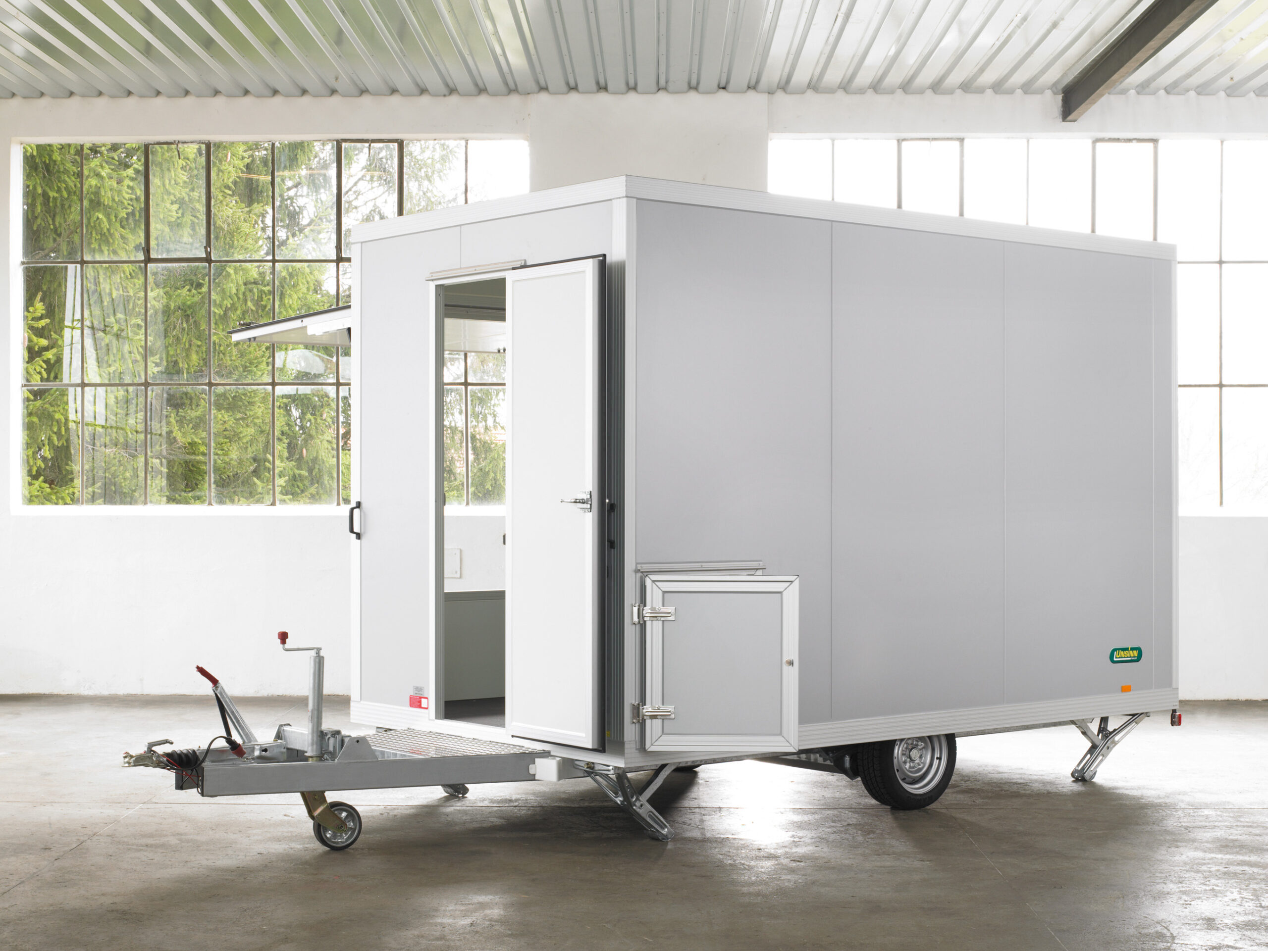 Thermo-Sandwich-Konstruktion mit 40 mm PU-Isolierung Feuerverzinkte und pulverbeschichtete Stahlblech-Außen- und Innenhaut Farbe: Silber RAL 9006 Eingangstüre in der Stirnwand (2000 x 650 mm) mit aufgesetztem Personenverschluss Auftritt auf Zugdeichsel Verkaufsklappe rechts mit Drehstangenverschluss, unten ca. 550 mm feste Brüstung