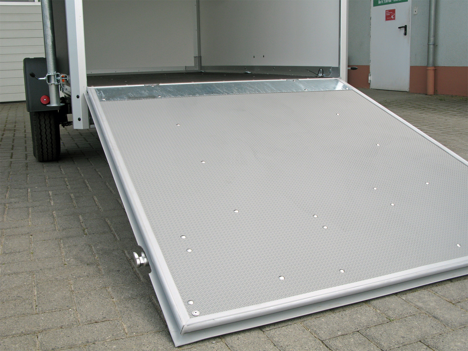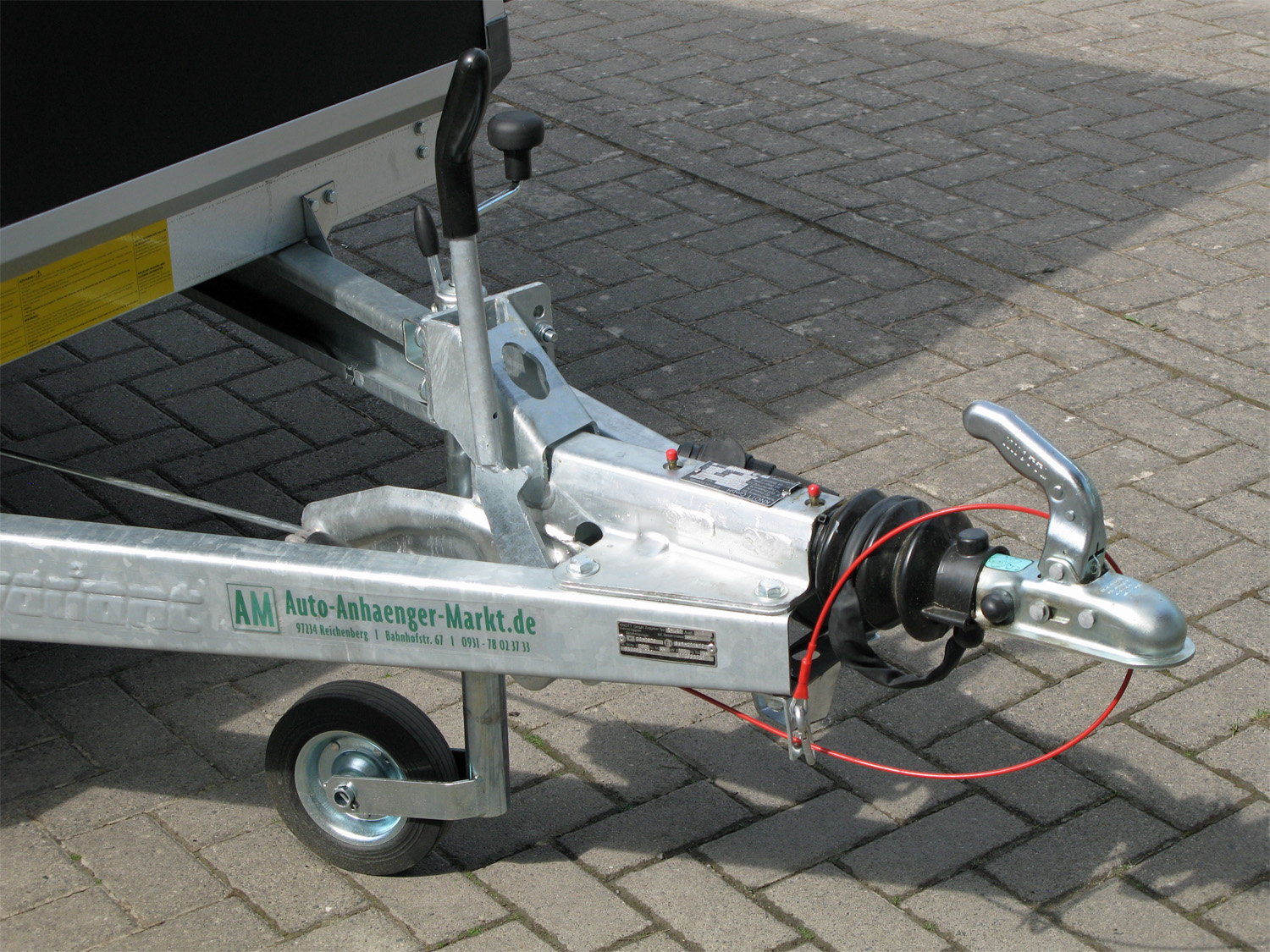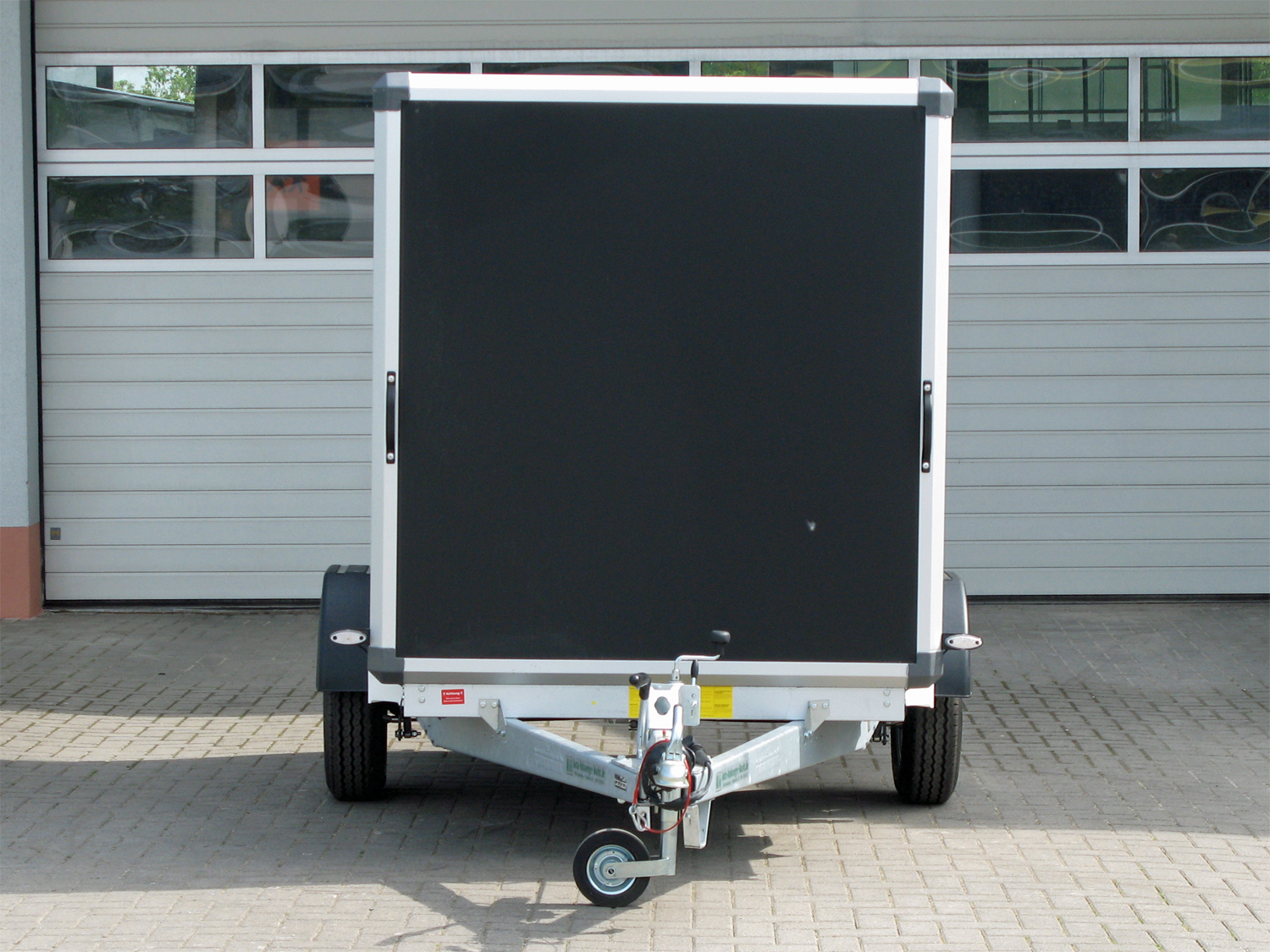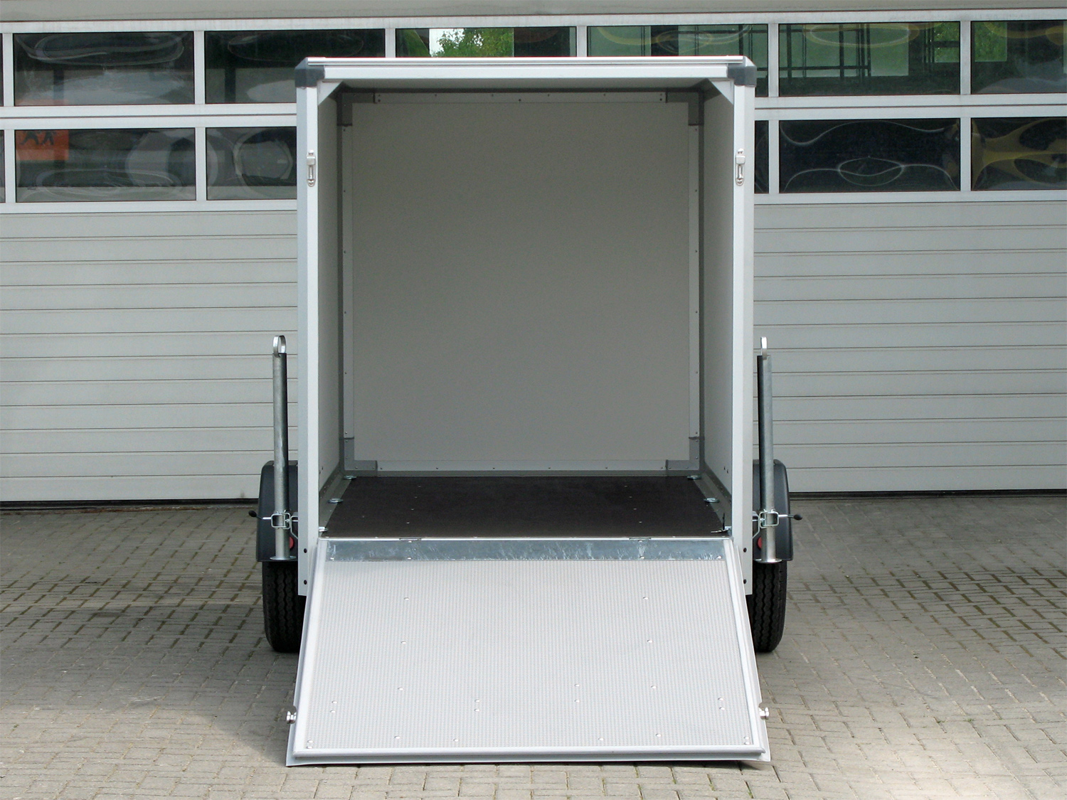 Die Konstruktion umfasst Leichtmetallräder, 2 Heckstützen und ein Furnierdach, während die Seitenwände außen schwarz und innen weiß gehalten sind. Die Auffahrrampe mit 18-Grad Auffahrwinkel erleichtert das Be- und Entladen.